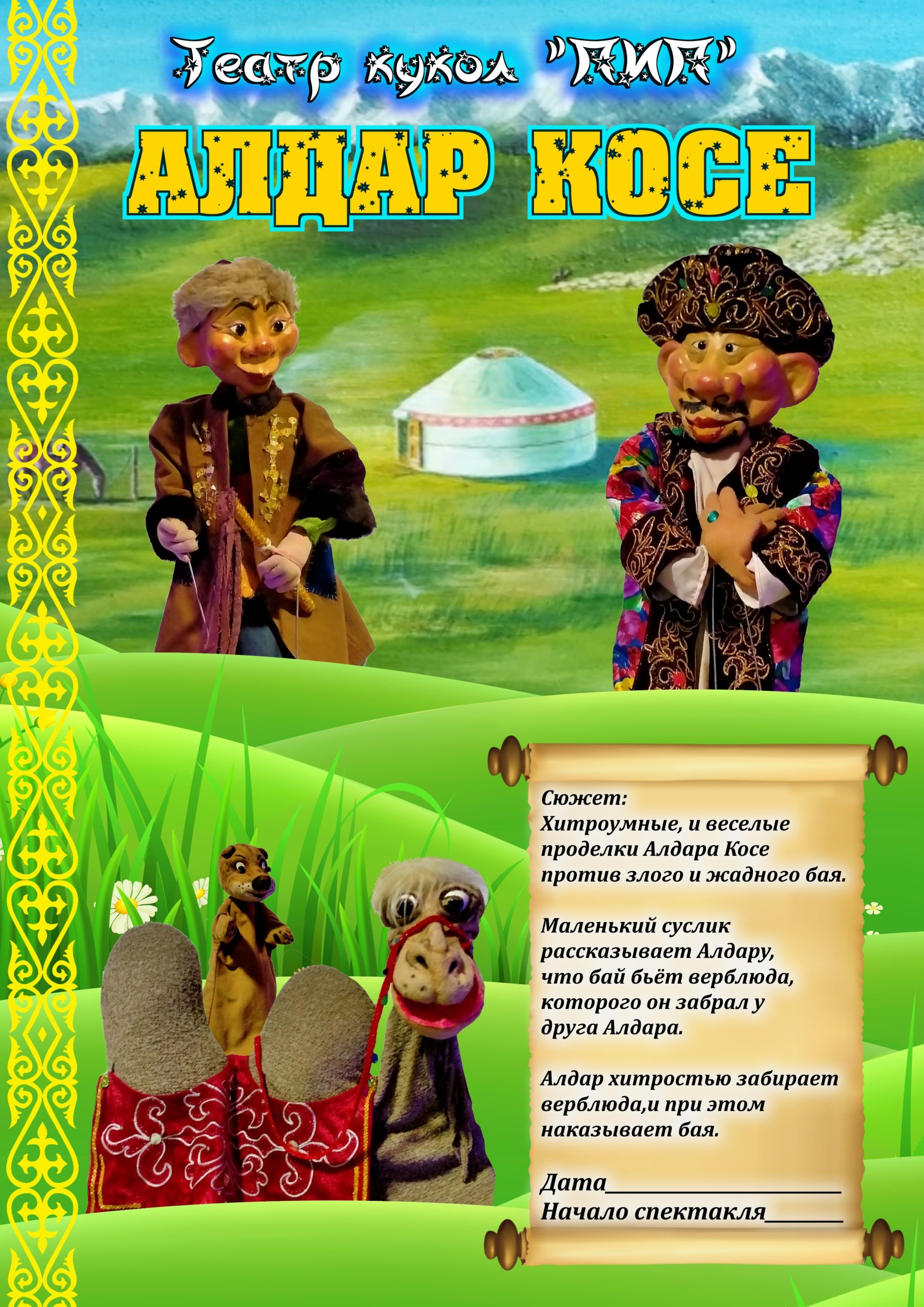 Персонажи: Алдар Косе, Бай, Верблюд, Суслик, Ведущие в национальных костюмах.