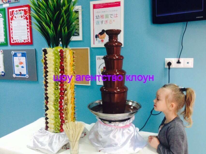 В стоимость входит аренда шоколадного фонтана, шоколад 1,5 кг., шпажки, салфетки, доставка и установка.